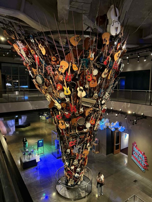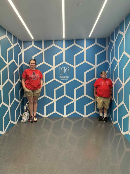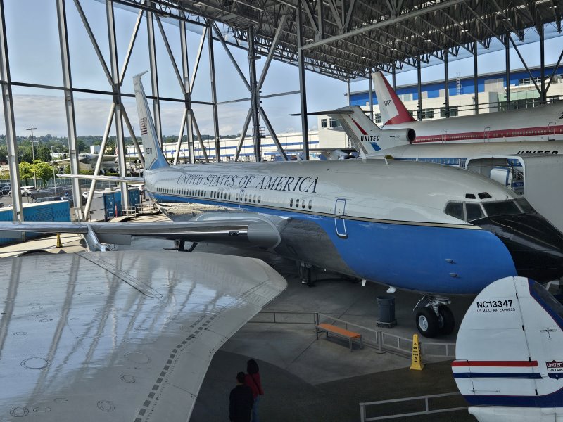 Our first full day in Seattle consisted of breakfast at a local eatery near our hotel. While we were there we looked up some things to do. Our first stop was the Museum of Illusions. There were lots of very cool exhibits. The second and much longer stop was at the Museum of Flight. Pictures from both are included below. One of the planes is the actual Air Force 1 used by Presidents Eisenhower, Kennedy, Johnson, and Nixon. Note the fake temperature switch which allowed the President to think he could adjust the cabin temperature. Yet another stop was the Seattle Museum of Pop Culture.